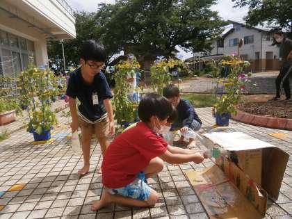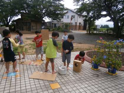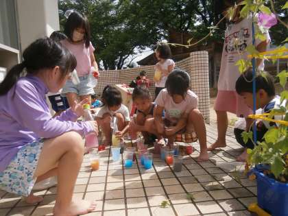 待ちに待った水遊びをしました。水鉄砲チームは的や盾を使って、色水チームはメニューやテーブル、看板をセットして笑顔いっぱい遊びました。