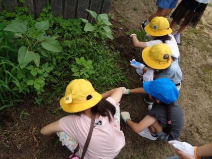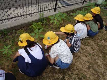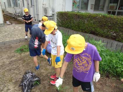 理科の「植物を育てよう」の学習で、ヒマワリ・ホウセンカ・ピーマン・オクラを育てています。今日は、植物のまわりに雑草がたくさん生えてきたので草むしりを行いました。植物を抜いてしまわないように、一つ一つ確認しながらきれいにすることができました。これから植物がどのように育っていくのか楽しみですね。