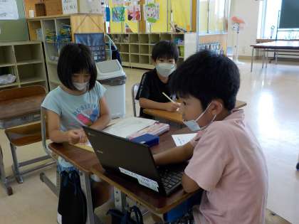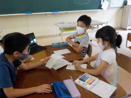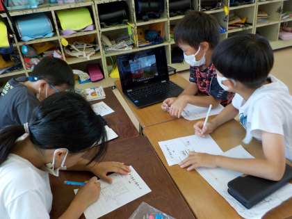 今日は町探検に出かけました。振り返りの様子です。発見した「すてき」をまとめています。見たこと、聞いたこと、感じたことを発見カードに書きためる子供たち。2学期以降の町探検も楽しみですね。