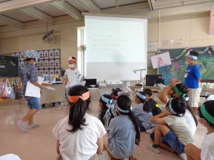 今日は、1学期おまつり集会でした。会社活動で準備してきたクイズやゲーム、イラストくじ等、みんなで楽しく遊んでいる様子が見られました。2学期もいろいろな会社の活動をみんなで楽しめるといいですね。