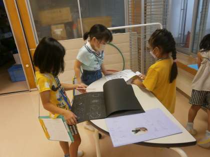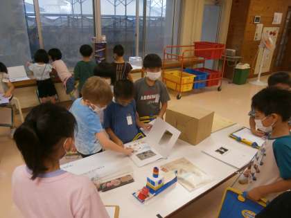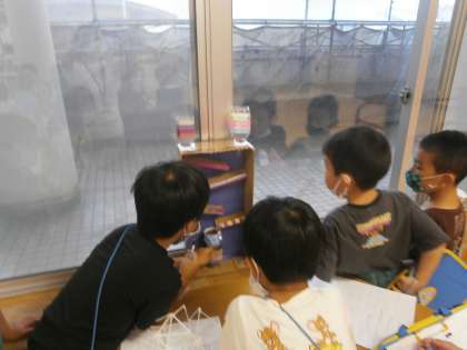 クラスの中で、夏休みの自由研究の見たい作品をじっくり見たり、友達と話したりしながら自由に見て回る時間を持ちました。