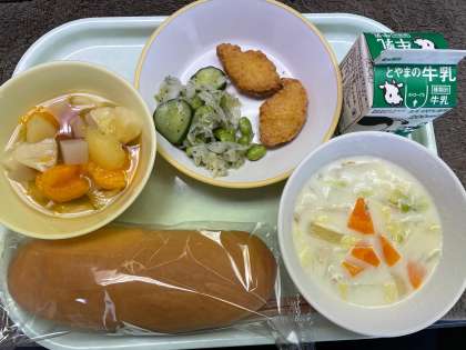 9月7日(水)の給食 公開日 2022/09/07 更新日 2022/09/07 全校 【献 立】 コッペパン、牛乳 チキンナゲット えごまドレッシングサラダ 白いんげん豆のクリームスープ フルーツカクテル