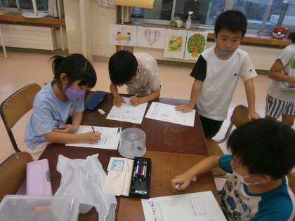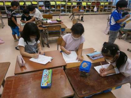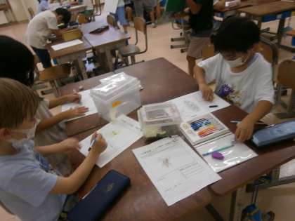 捕まえてきた虫たちを観察しました。虫の様子やお世話の仕方をワークシートに一生懸命書いていました。中には虫の苦手な子達もいますが、「頑張って好きになるね。」と書いていました。