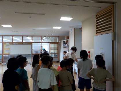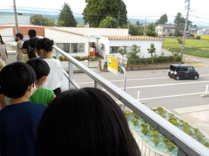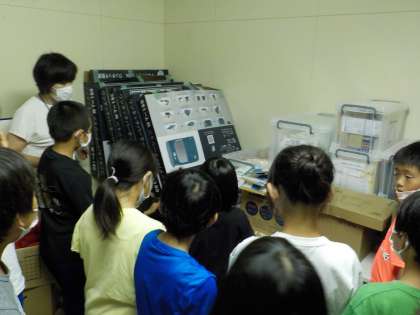 社会科では、今、防災について学習しています。今日は、学校の防火施設である防火シャッターや消火栓、避難所を開設するための用具などを見ました。