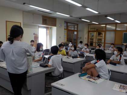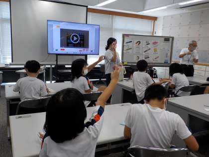 今日は、「DO YOU HAVE A〜」のフレーズで、ペンやのりなど、文房具を当てはめて、英語でのやりとりを楽しんでいました。