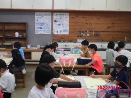 絵の具やクーピー、色鉛筆、クレヨンといろいろ工夫して書いています。完成が楽しみです。