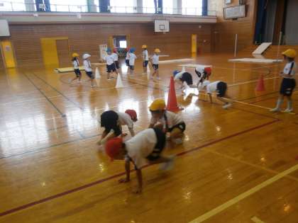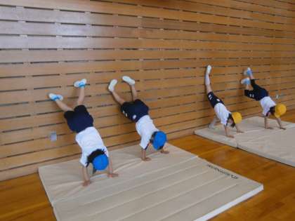 準備運動で、犬歩きやうさぎとび、クモ歩きをして手を着く練習をたくさんしました。マットでは、いろんな練習場所でコロ!クル!ピタ!と回ったり、支えたりを楽しみました。肋木で逆立ちをしたり、前転がりと横転がりを連続でやってみたり、とっても上手に決まって拍手をもらっていました。
