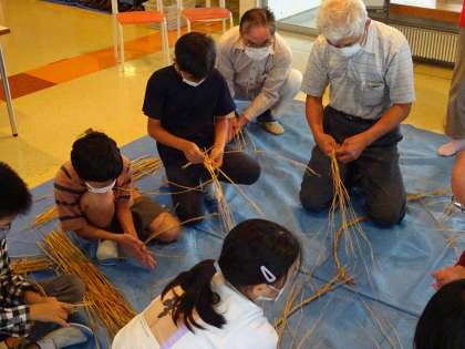 今日は大寿会の皆さんをゲストティーチャーにお迎えして5年生の縄なえ体験を行いました。子どもたちは真剣な表情で、縄の作り方を教わっていました。