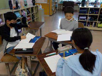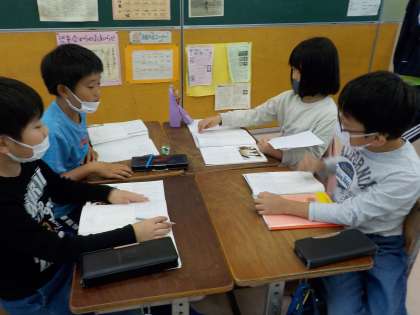 国語科「ごんぎつね」の学習をグループで進めています。叙述を基に、ごんの気持ちについて話し合っています。司会者を中心に、話し合うのが少しずつ上手になってきました。