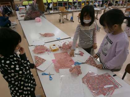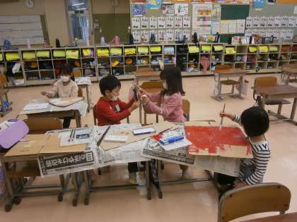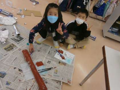 学習発表会に向けて、いろいろな道具を作っています。みんなでアイデアを出して、お話しを盛り上げるものを作っています。