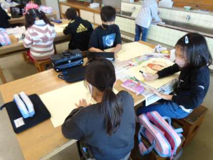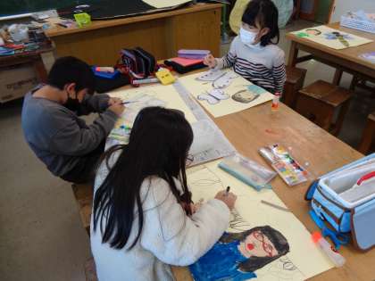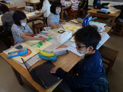図工で取り組んでいた虫と関わる自分をかいた作品が仕上がりました。虫を細かくていねいに観察してかいたり、自分のポーズや表情を工夫したり、仕上げの虫を貼る位置にこだわったりして、個性豊かな作品に仕上げることができました。