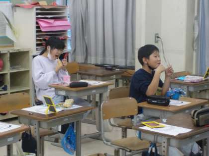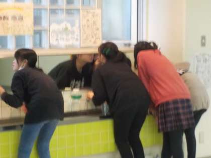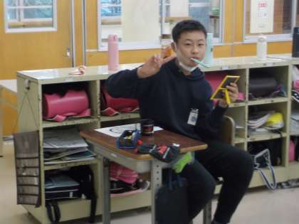 給食後の歯磨きの時間は、クロームブックでタイピング練習をしながら、連絡帳を書きながら歯を磨いている様子が見られます。