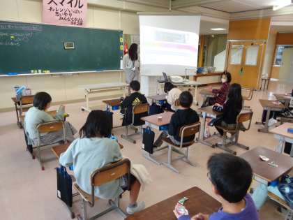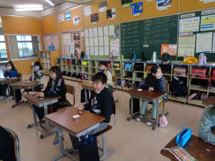 今日はいい歯の日ということで、かむことについて学習しました。昔と今の食事を比べてかむ回数や食事の時間が減っていることに気づくことができました。かむ力を確かめるために、かむ力によって色が変わるガムをかんで、自分のかむ力を知ることもできました。養護教諭の先生にも参加していただき、これからの生活でよくかんで食べるためにどうすればいいか考えました。これから実践していきましょう。
