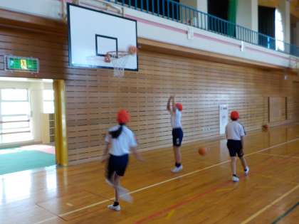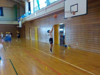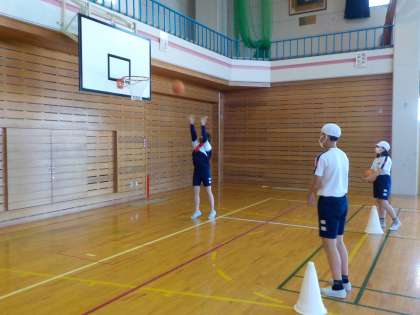 ゴール下ではフリーの状態で確実にシュートを決めたり、3対2の状況で空いている人を見付けパスを出したりするなど、ゲームで生かすための練習をしています。