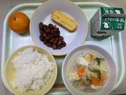 【献 立】 ごはん、牛乳 厚焼きたまご 煮豆、塩こうじ鍋 みかん