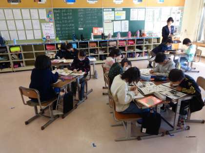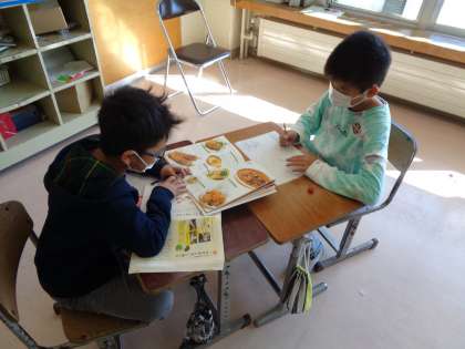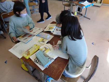 国語では「すがたをかえる大豆」の説明文を読み、説明の工夫について考えてきました。今日はその学習を生かして自分が興味のある食べ物のひみつについて書くための、メモを作成しました。同じ食べ物を選んだ仲間同士でグループを作り活動しました。グループで話し合いながらどのグループも協力して学習を進めることができました。