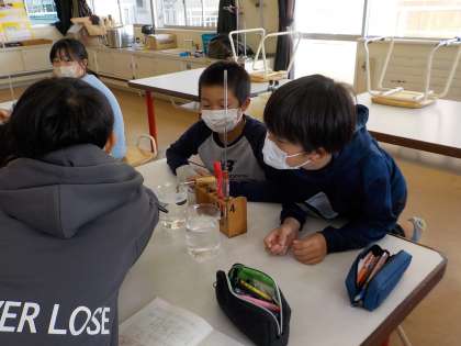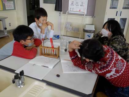 パート2の実験として、金属は、温めると体積が変化するかを実験しました。子供たちは、きっと変化すると考えていましたが、金属の玉をお湯につけただけは体積は変化しませんでした。温めが足りないという考えから、次は金属を熱することになりました。次の実験が楽しみです。