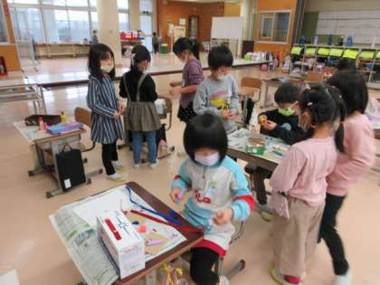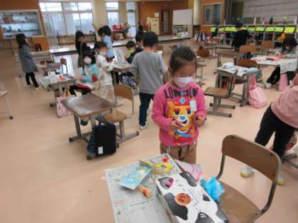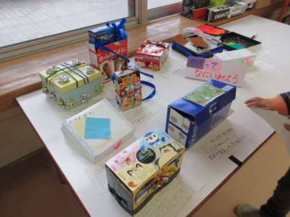 箱にたくさん飾りをつけて、自分の宝物やお気に入りのものを入れる箱を作りました。大きい箱、小さい箱、ひもで下げられる箱、きらきらな箱と楽しい箱が沢山できました。