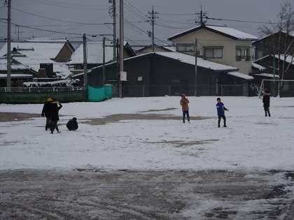 今日は、昨日からの降雪でグラウンドにも雪が積もりました。
