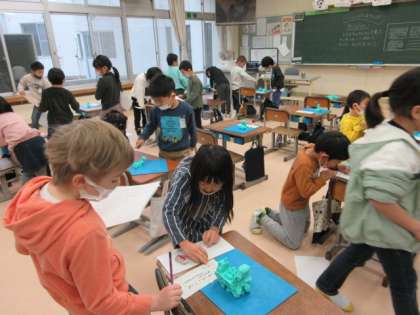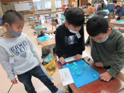 粘土の作品を鑑賞しました。お友達の作品を見て、思ったことを話したり聞いたりしながら、それぞれの作品の良さを感じていました。