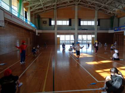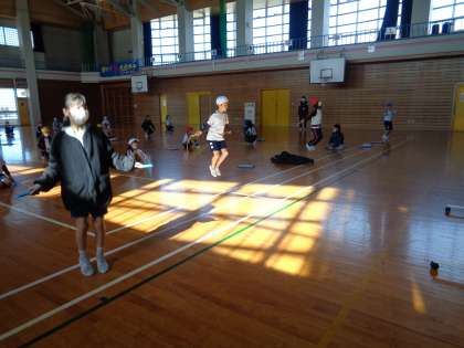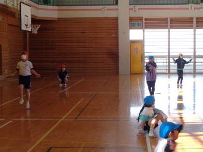 今日の体育は、色団ごとに短縄のわざをつなげるなわとびリレーをしました。最後まで残るために、1回でも多く飛ぼうと一生懸命な姿や友達を応援する様子が見られました。