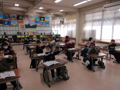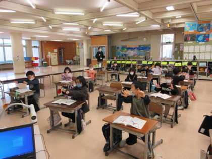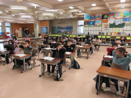 書写の時間、字が上手に書けるように最初に体操をします。7秒間指を組んで引っ張る体操や腕を前に伸ばしてグーパーを繰り返す体操です。手指の準備をして、漢字の「とめ、はね、はらい」を丁寧に書いて練習をしました。