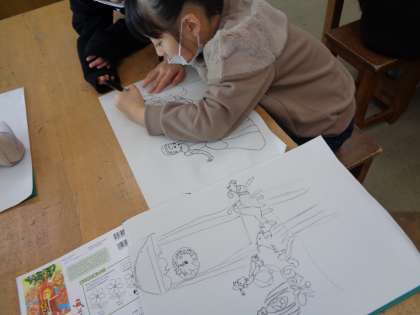 今日の図工はゴム版画でした。昔話や童話の世界を上手に下書きしていました。