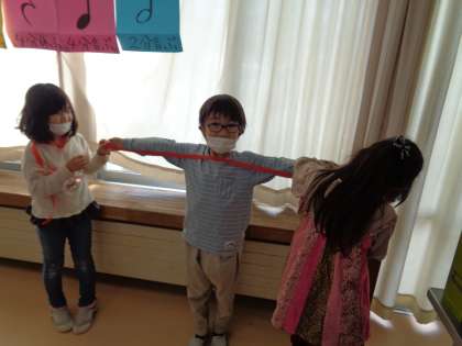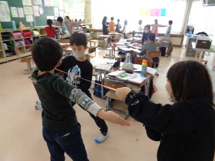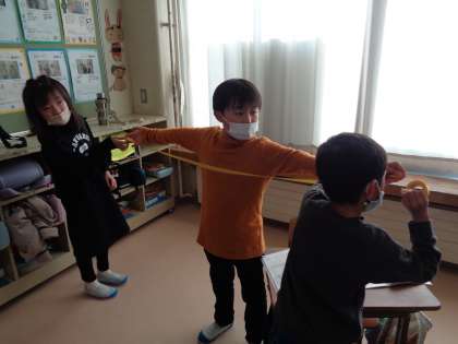 算数の時間に、両手を広げた長さを紙テープを使って切り取り、その長さを1mものさしを使ってはかりました。意外と長い、と感じた子ども達が多かったみたいです。