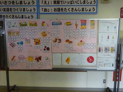 家庭科室前にはいろいろなお菓子やジュースに含まれる糖分量についての掲示があります。