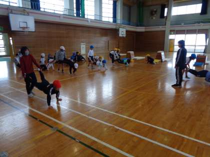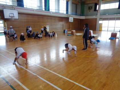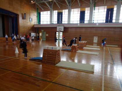 体育ではとびばこに取り組んでいます。自分で目標を決めて、何度も繰り返し練習しています。まず、とびばこを跳ぶ前に手足を使った運動を行い、それからとびばこに挑戦しました。回を重ねるごとにとべる段が増えていって、新しい技に挑戦する人もいます。準備運動をしっかりして、安全に気をつけながらどんどん挑戦していきましょう。