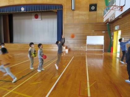 昼休み、運動委員会の企画でバスケシュートをしました。高いゴールに向かって、精一杯伸びてシュートを決めていました。「ナイスシュート!」の声に笑顔で応えていました。