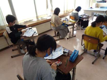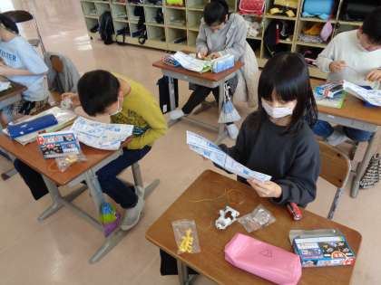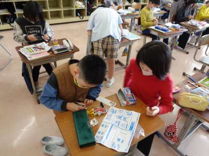 理科では、「明かりをつけよう」の復習で、ホタルのおもちゃづくりを行いました。スイッチの仕組みを理解して、電気を通す物をスイッチの間に入れて工夫している子もいました。友達と教え合い、助け合ってつくる姿がすてきでした。
