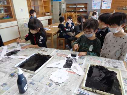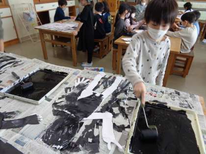 今日は、今までつくってきた自分たちの姿の型紙を、黒のインクで刷りました。画用紙を重ねることでできた輪郭がきれいに刷れて、うれしそうな様子が見られました。