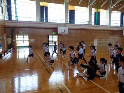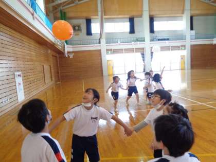今日の体育は、いろいろな集団運動を行いました。体を使ったじゃんけんやなべなべそこぬけ、わっかになって手をつないで風船を落とさないように協力するなど、みんな一生懸命取り組んでいました。