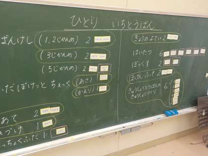 1年生は学級活動で、「一人一役の係の仕事」を決めました。早く仕事に慣れてみんなのために活動してください。