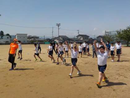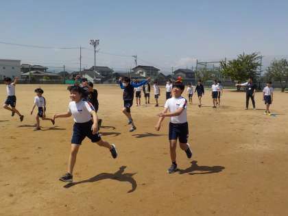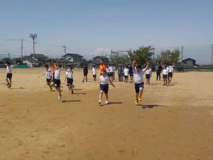 6年生は快晴の空の中、走り方教室を行いました。速く走るための動きづくりなどをしました。熱心に取り組みました。