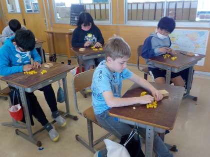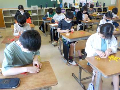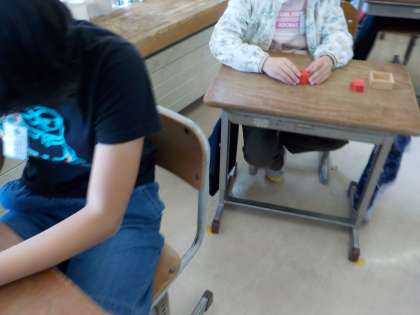 算数です。もののかさをを表す1立方センチメートルを学習し、1立方センチメートルの立体を使って様々な体積の直方体や立方体を作りました。1立方センチメートルは意外と小さくて作業もなかなか大変です。片付けは協力して素早く終わりました。