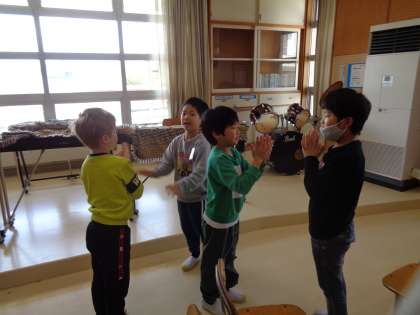 今日の音楽は、歌に合わせて友達と手をたたいたり、体の一部分をたたいたりして、はくのまとまりを感じとりました。歌いながら手をたたくのは難しそうでしたが、友達と楽しそうに取り組んでいました。