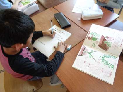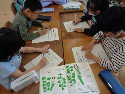 生活の学習では、自分で決めた野菜を苗から育てます。元気に育つためには、どんなお世話をしなければいけないのか、本で調べました。知らないことがたくさんで、大変そうだと感じている子供がたくさんいました。