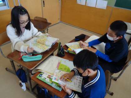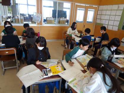 社会では、日本の主な地形について調べました。グループで聞き合いながらワークシートをまとめました。少し根気のいる作業でしたが、地図帳や資料集を上手に使ってまとめることができました。