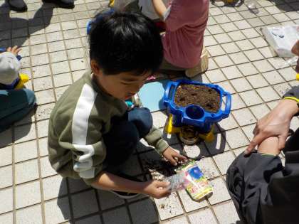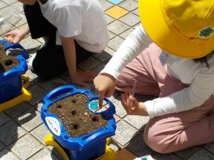 種を植えたあとは、あさがおに名前を付けたり、水をやる量や時間、鉢を置く場所について話し合ったりしました。