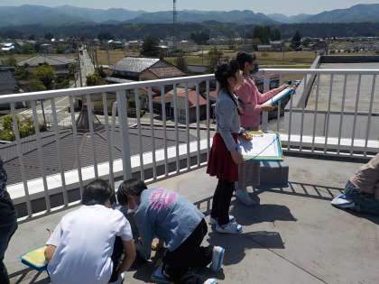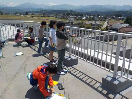 3年生は社会科で、学校の屋上から見える物を観察しました。子供たちは方位磁針を使って、四方位を確かめながら何がどの方角に見えるかを観察しました。