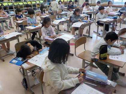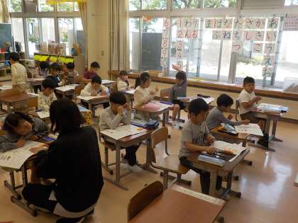 1年生は算数科で、7について数の合成を学びました。子供たちはブロックを使いながら合わせて7になる数の組み合わせを考えました。
