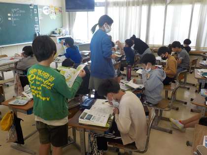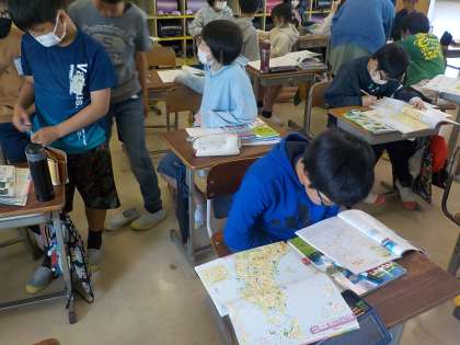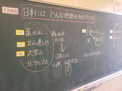 5年生は社会科で、日本の国土の特色を学習しています。子供たちは山地が多いことを捉えながら、主な山脈や山地、河川の名前を調べました。