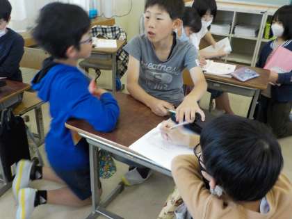 グループになって、質問を考えたり、実際に聞いたりしています。記録係もいて、最後は記録係が友達の紹介文を書き発表します。どんな紹介になるのか楽しみですね。