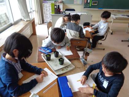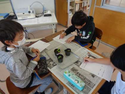 今日は「オクラ」「ヒマワリ」「ホウセンカ」の中から一つ選び、それぞれ観察しました。植物によって葉のさわり具合や、においも違うことに気付いていました。「ピーマン」はまだ芽が出ておらず、まだかな、といつ出てくるのか気になっている様子でした。