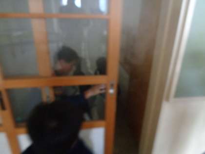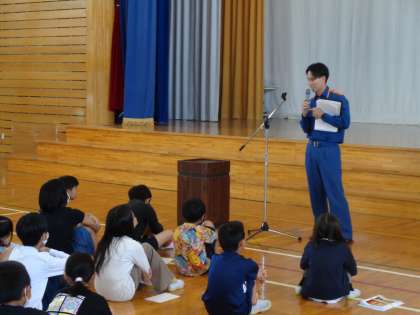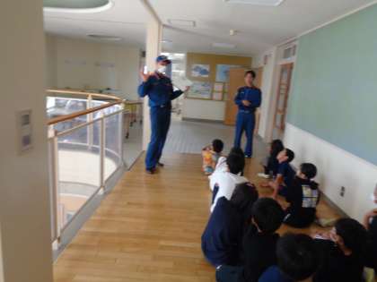 その後行われた防火教室では、煙中体験をしました。図工室いっぱいに煙が広がっていて、前が見づらいことを感じていました。低い体勢で避難することや、壁づたいに避難することなどを学びました。