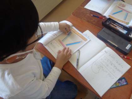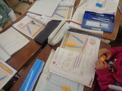 今日から算数は、長さの学習が始まりました。鉛筆の長さを比べるために、消しゴムやブロックを使って何個分かで比べました。最後には長さの単位「センチメートル」を学習しました。