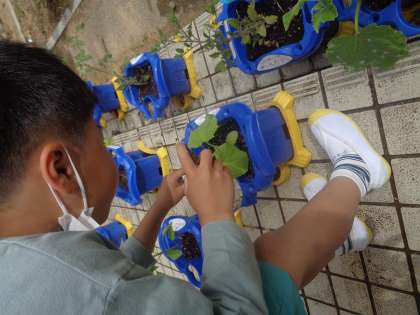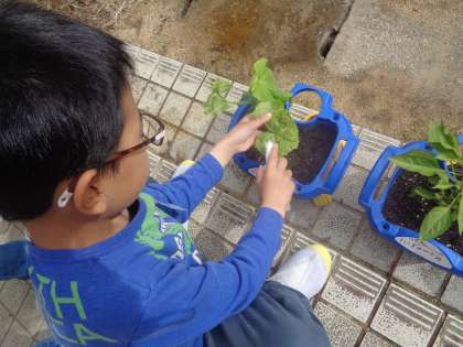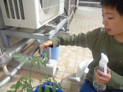 今日は、朝から子供たちが野菜のためにお酢を薄めたスプレーをかけていました。うどんこ病にならないために一生懸命お世話しています。
