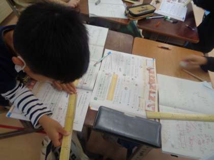算数の学習では、竹ものさしを使って線の長さを測りました。センチメートルをミリメートルに表し直す方法を考えました。